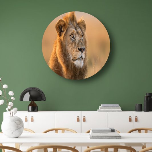 Majestueuze Leeuw in Gouden Avondlicht aluminium muurcirkel