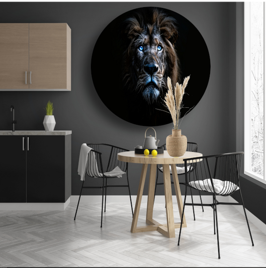 Indrukwekkende leeuw met hypnotiserende blauwe ogen aluminium muurcirkel
