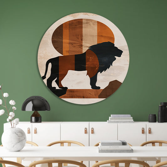 Leeuw silhouet tegen oranje zon in minimalistische stijl aluminium muurcirkel