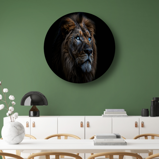 Indrukwekkend portret van majestueuze leeuw met blauwe ogen aluminium muurcirkel