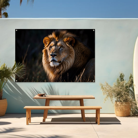 Majestueuze leeuw in donkere achtergrond tuinposter