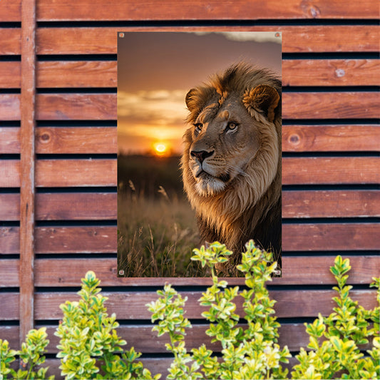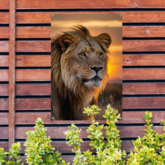 Majestueuze leeuw bij adembenemende zonsondergang tuinposter