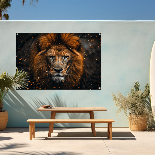 Mysterieus leeuwenportret met rustieke details tuinposter