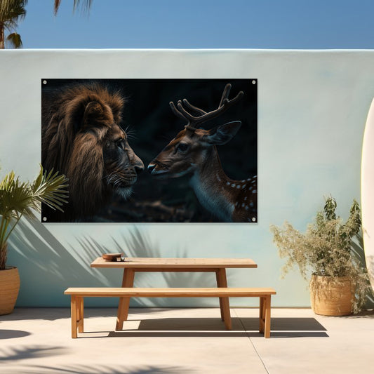 Leeuw en hert tegen donkere achtergrond tuinposter