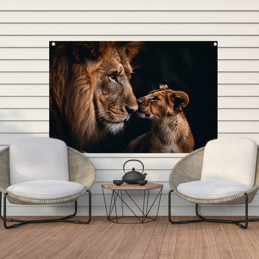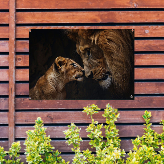 Intieme ontmoeting tussen leeuw en welp tuinposter