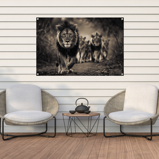 Mysterieus leeuwenportret in rustieke stijl tuinposter