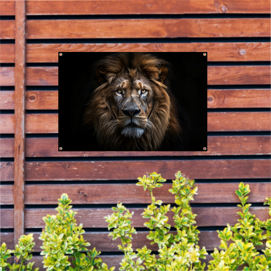 Indringende leeuwenblik in schemerige duisternis tuinposter