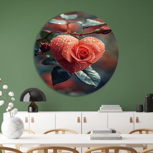 Rode roos in de vorm van een hart met dauwdruppels aluminium muurcirkel