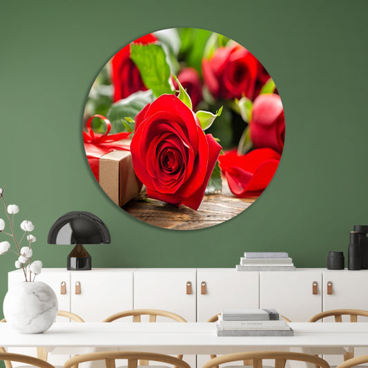 Rode rozen liefde op rustieke houten ondergrond aluminium muurcirkel