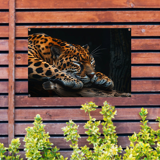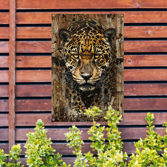 Dynamisch jaguar kunstwerk op houten achtergrond tuinposter
