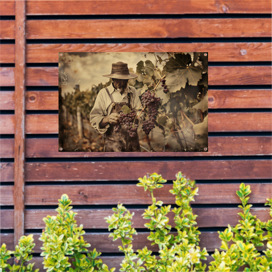 Oude wijnboer verzorgt zijn druiven tuinposter