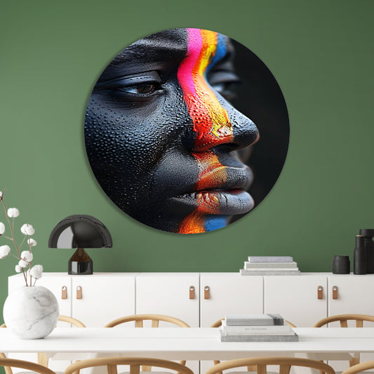 Dynamisch Gezicht met Kleurrijk Regendruppels aluminium muurcirkel