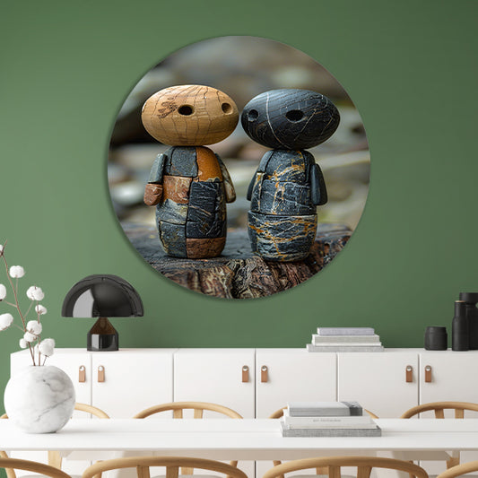 Twee Stenen Figuren op Boomstronk aluminium muurcirkel