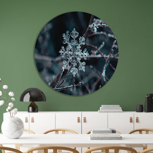 Macro-opname van een sneeuwvlok op takken aluminium muurcirkel