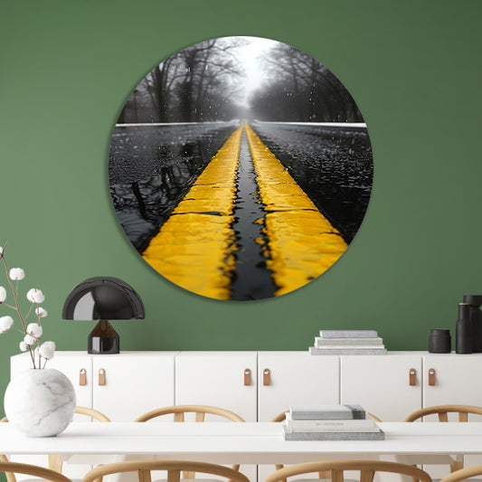 Regenachtige weg met gele strepen aluminium muurcirkel