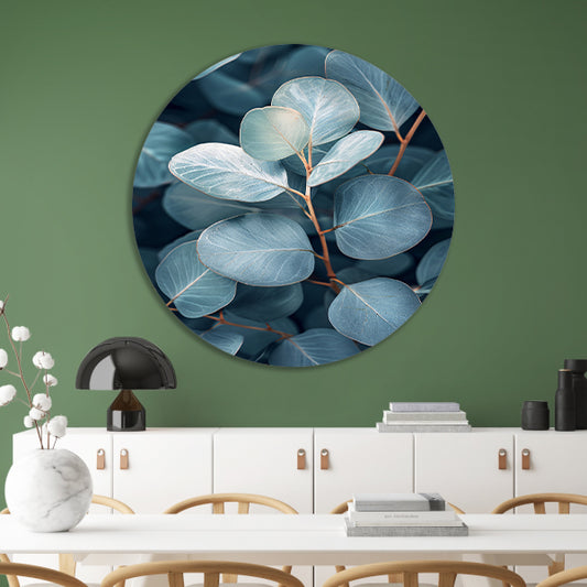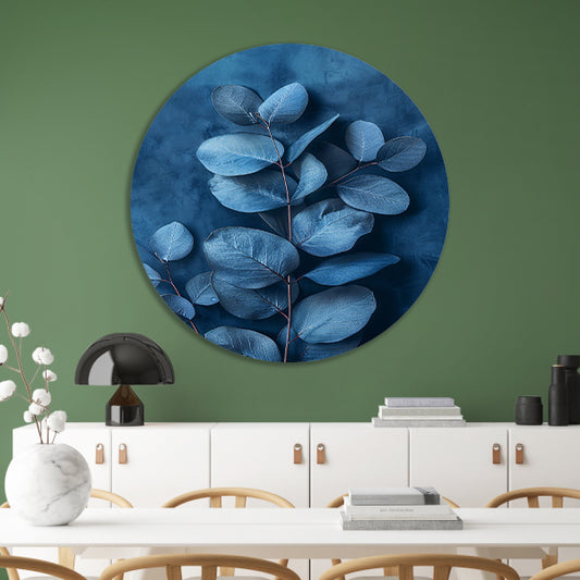 Minimalistische Weergave van Blauwe Eucalyptus Bladeren aluminium muurcirkel