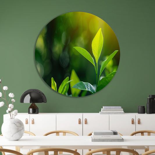 Helder Groen Blad in Zonlicht aluminium muurcirkel