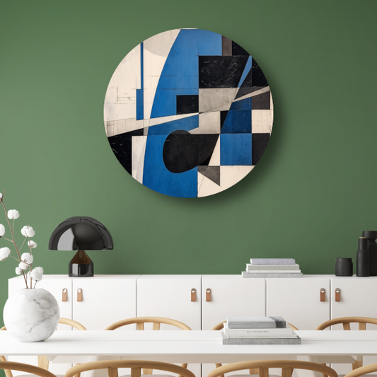 Abstract schilderij in blauw, wit en goud forex muurcirkel