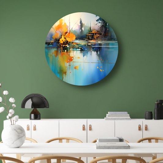 Aquarel compositie in blauw, geel en wit forex muurcirkel