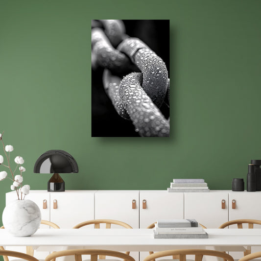 Zwart-witfoto van dauwdruppels op een ketting poster