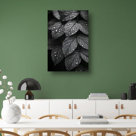 Zwart-witfoto van dauwdruppels op bladeren poster