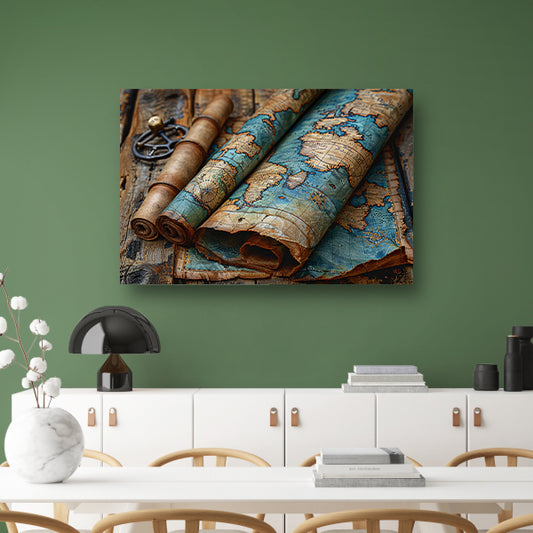 Opgerolde Wereldkaart op Houten Tafel. poster