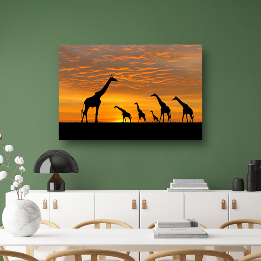 Silhouetgiraffes Zonsondergang Savanne poster