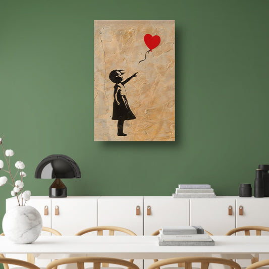 Meisje reikt naar zwevend hart op gebarsten achtergrond canvas