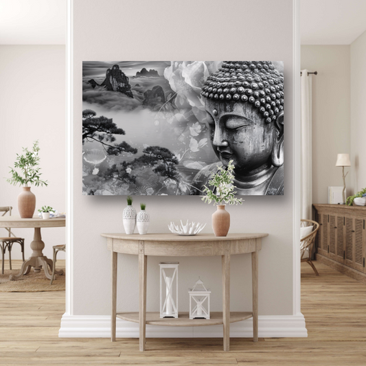 Serene Boeddha met Mistige Bergen canvas met baklijst