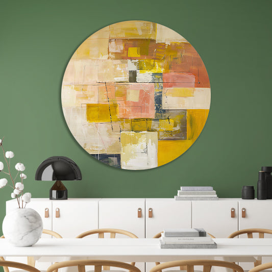 Abstract geometrisch schilderij met kleurblokken aluminium muurcirkel