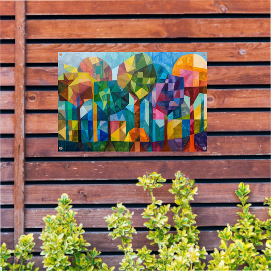 Abstracte kleurrijke bomen in geometrische stad tuinposter