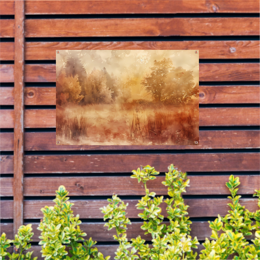 Nevelig sepia boslandschap in herfstsfeer tuinposter