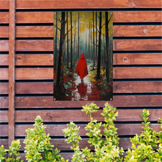 Eenzame figuur in Herfstbos met Rode Mantel tuinposter