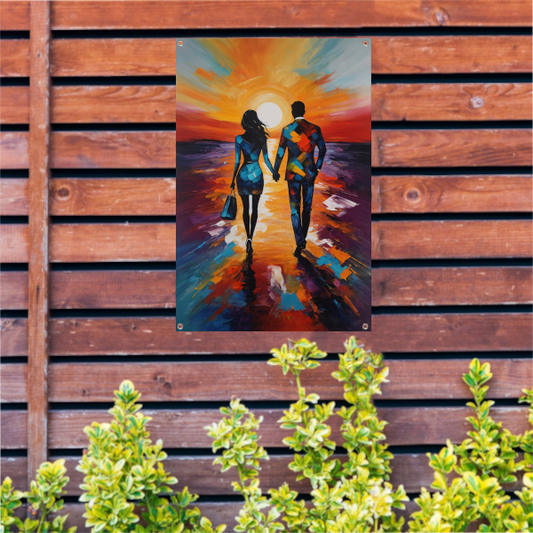 Stijlvol paar wandelt tijdens kleurrijke zonsondergang tuinposter