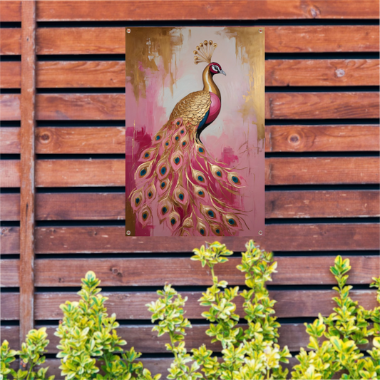 Elegante Gouden Pauw op Roze Achtergrond tuinposter