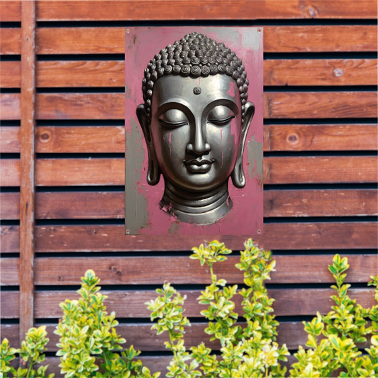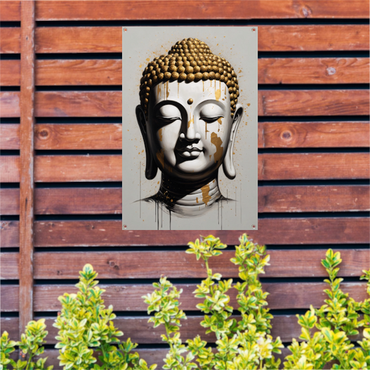 Boeddha Hoofd met Gouden Druppels Modern Kunstwerk tuinposter