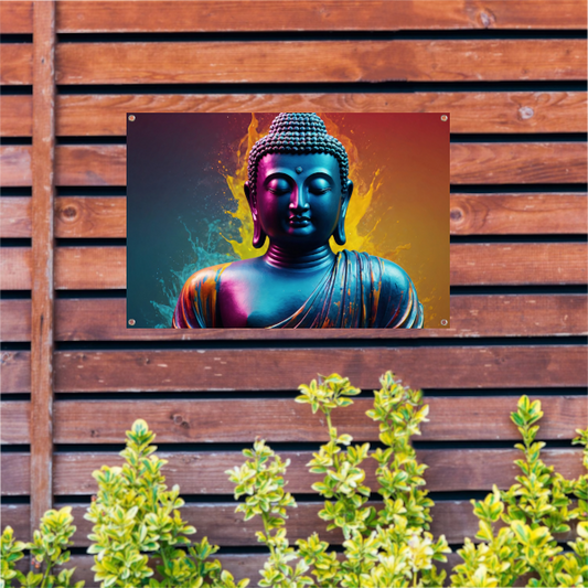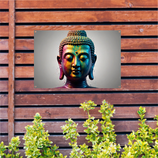Boeddha Hoofd in Verrassende Kleurexplosie tuinposter