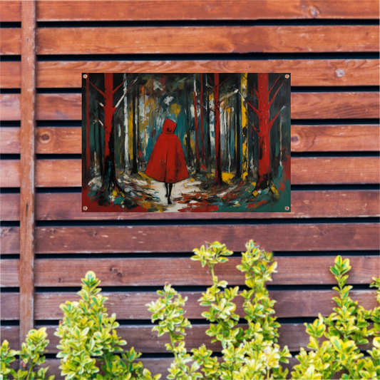 Eenzame Rode Figuur Wandelend in Kleurrijk Bos tuinposter
