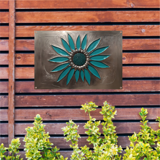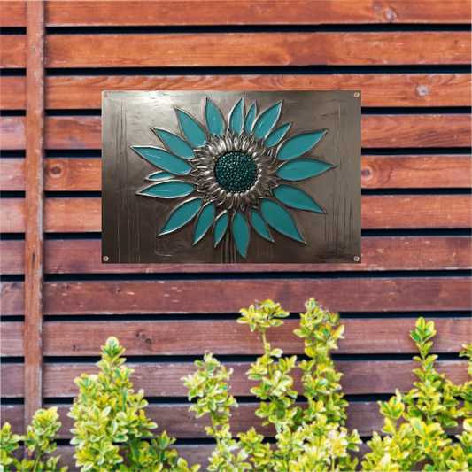 Turquoise Zonnebloem in Metalen Stijl Decor tuinposter