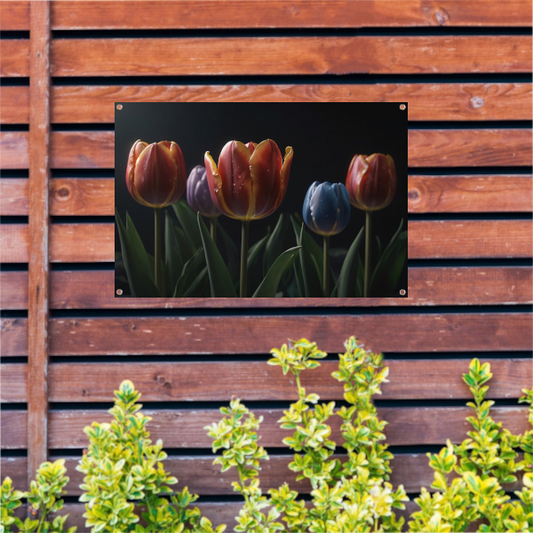 Tulpenpracht met waterdruppels in kleur tuinposter