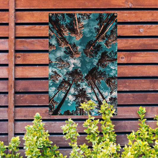 Zwart-wit foto van boomtoppen in het bos tuinposter
