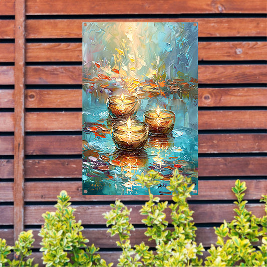 Abstracte schilderij van drijvende kaarsen tuinposter