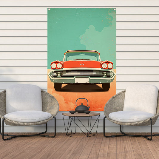 Rode Klassieke Auto op Blauwe Achtergrond tuinposter