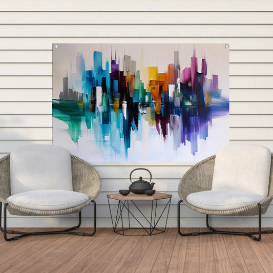 Kleurrijke abstracte skyline met reflecties tuinposter