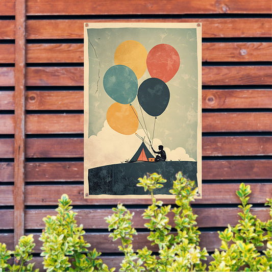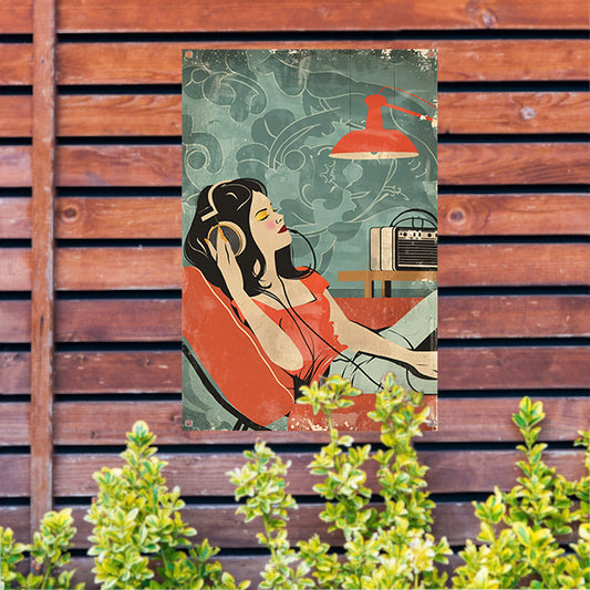Vrouw luistert naar muziek in vintage stijl tuinposter