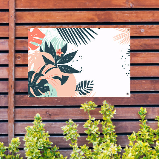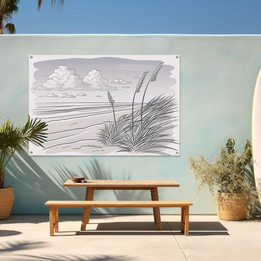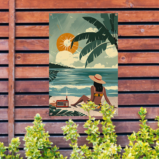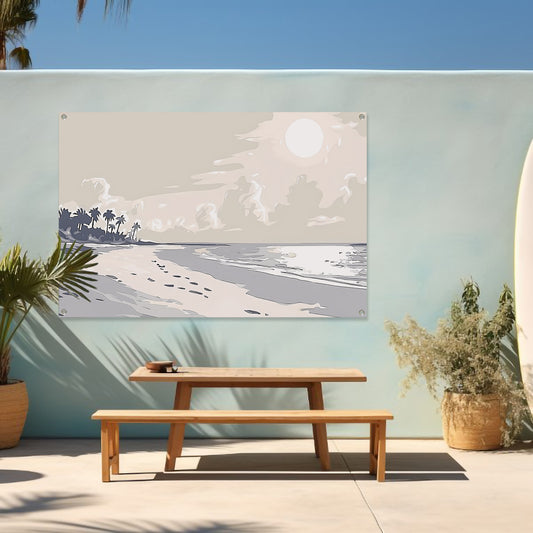 Rustgevend strandontwerp met palm silhouetten tuinposter