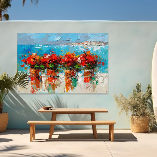Kleurrijke bloemen met zee op achtergrond tuinposter