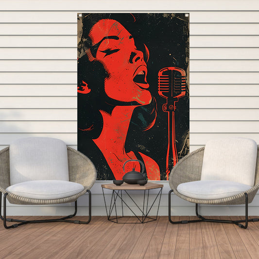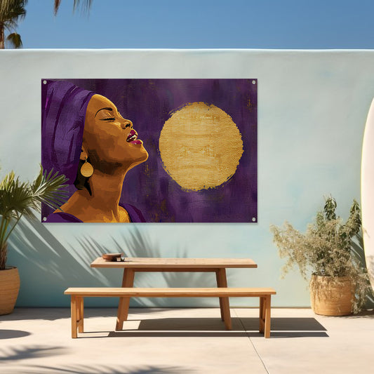 Afrikaanse vrouw met paarse doek en gouden maan tuinposter