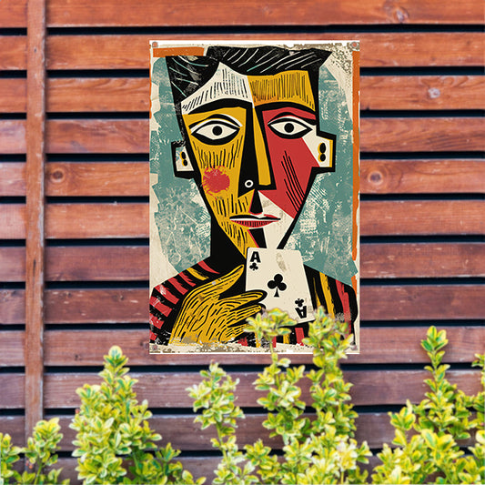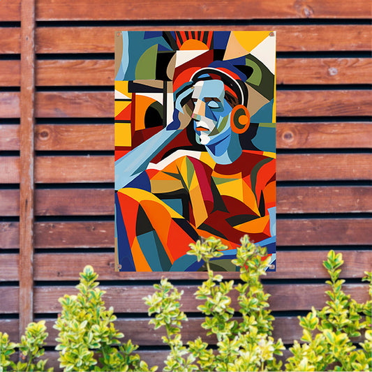 Kubistische man met koptelefoon in abstracte wereld tuinposter