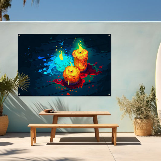 Surrealistische kleurrijke kaarsen op donkere achtergrond tuinposter